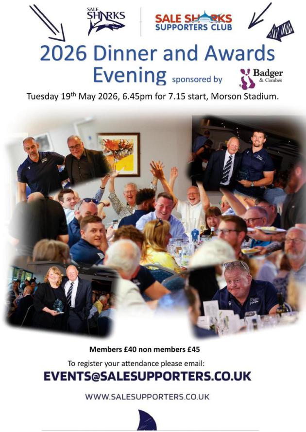 This is an informal, non-corporate evening where players, coaches, owners and other valuable Sharks team members get together and mingle with us grass roots supporters. We will enjoy a three course meal sat at tables where players and coaches etc will join us. The support and friendliness of Sale Sharks makes this an evening not to be missed. Places are limited so early booking is advised by the link events@salesupporters.co.uk.